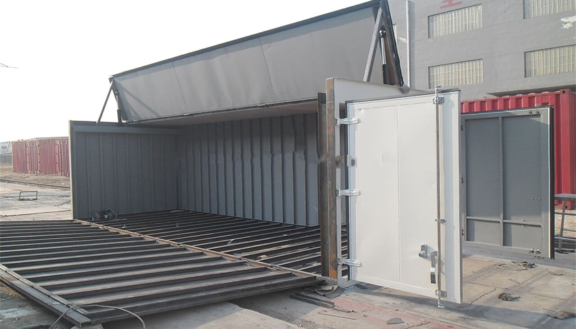 起到防水防雨的功能,其水密要求和干货箱一样,可以用起 重机从箱顶上面装卸货物。适用于装载体积高大的大型货物和需要吊装的重物,如钢管、板材、大型机械等。